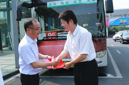 7月28日上午,祝亞偉副市長一行深入基層,向冒著高溫酷暑堅守在工作崗位上的公交一線員工表示感謝和慰問,并送上防暑慰問品和慰問金。集團公司董事長沈蘭冠、公交公司相關負責人陪同慰問。